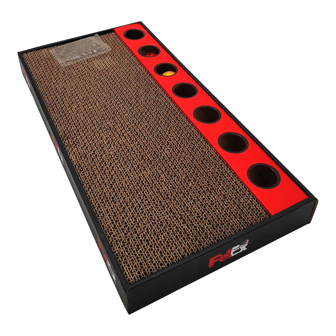 עם זוג כדורים מרשרשים לגירוי החתול , מידה 48X25X5 ס”מ , עשוי קרטון ממוחזר.