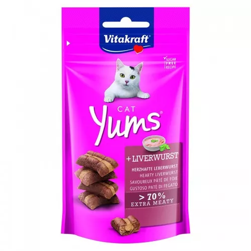 חטיף קט יאמס בטעם נקניקיות כבד מפנק וטעים במיוחד, מכיל מעל 70% רכיבים מן החי. בעל אחוז חלבון מן החי גבוה. החטיפים עשויים מרכיבים איכותיים, טעימים במיוחד וללא תוספת סוכר. מומלץ לתת בין הארוחות או כפרס, יש לדאוג למים טריים לצד המזון. יש לשמור סגור במקום קריר ויבש