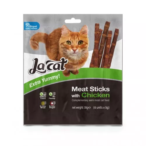חטיף מקלות בשר עם עוף לפינוק האולטימטיבי לחתול שלך. החטיף הטעים של לה קט מיוצר במפעל מתקדם ומרכיבים איכותיים. הוא אינו מכיל צבעי מאכל וחומרי טעם. החטיף ללא תוספת סוכר.
