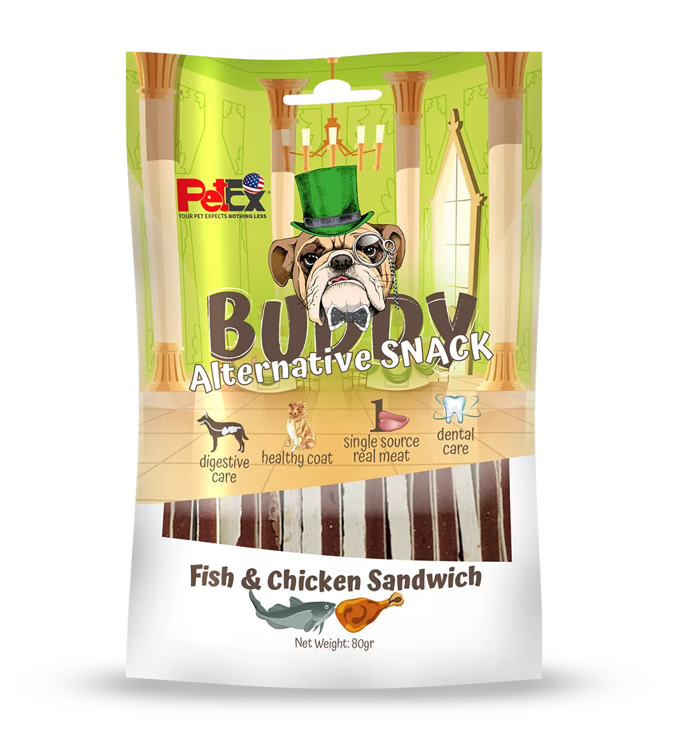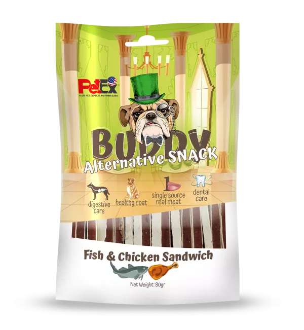 באדי סנאק -חטיפי מקלות עוף ודגים, פרוסים דק דק במשקל של 80 גרם