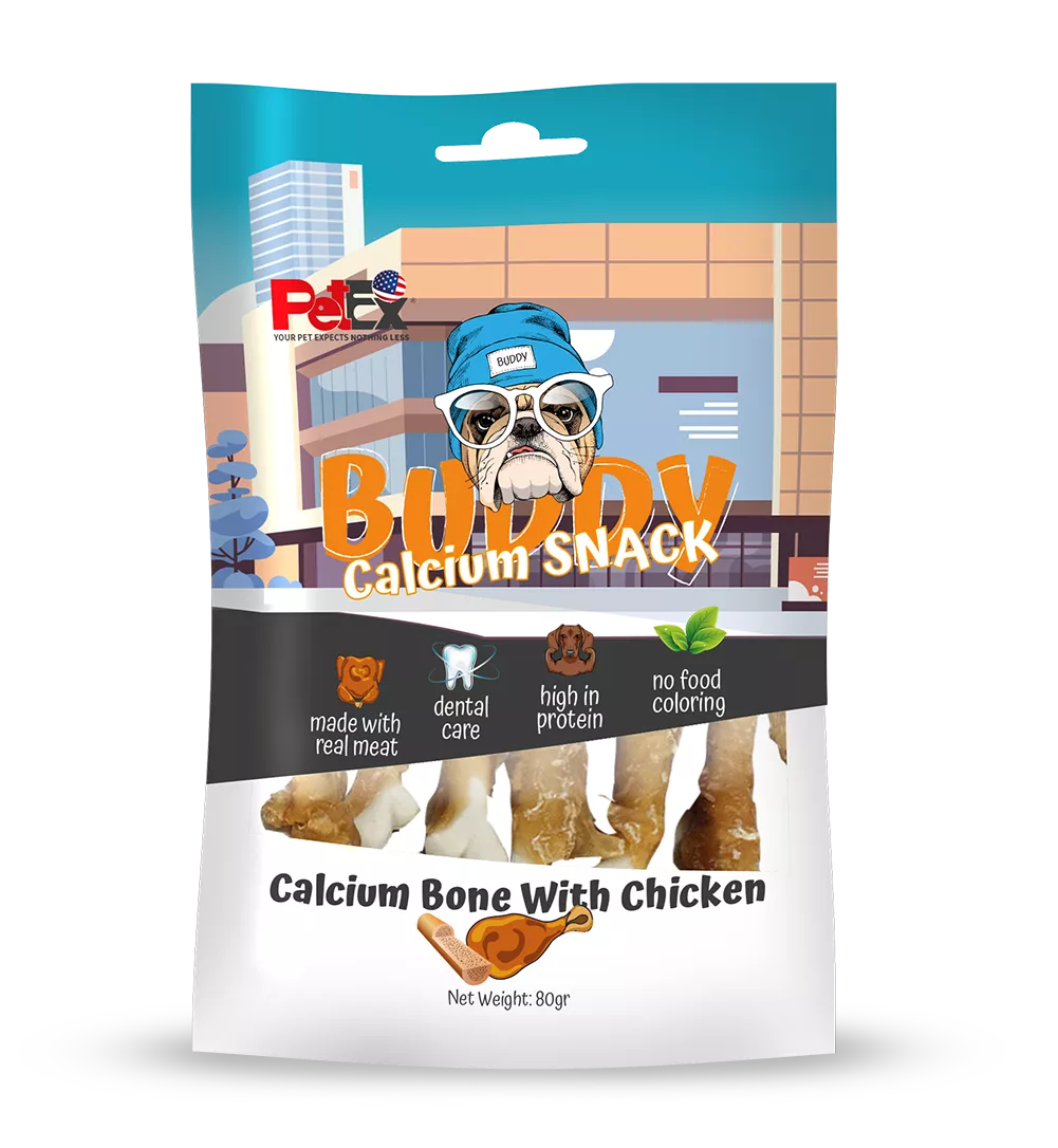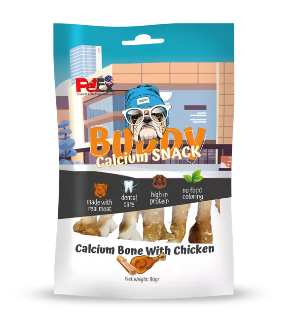 באדי סנאק חטיף עצם קלציום בציפוי בשר עוף.
