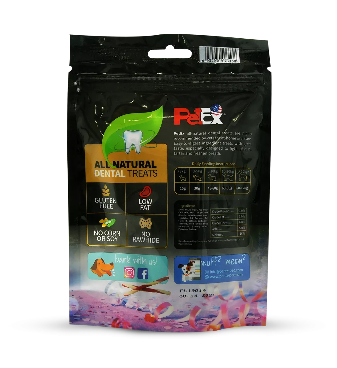 תכולת רכיבים תזונתית: קמח בטטה, קמח אפונה, בשר עוף גליצרין צמחי שומן צמחי, מבשלת שמרים מיובשת,קלציום קרבונט, חמאת בוטנים, טעם טבעי מעושן, שמן מנטה ,פטרוזיליה, אבקת סודה לשתייה, כלורופיל, עגבנייה מיובשת (מקור לליקופן), אשלגן סורבט.