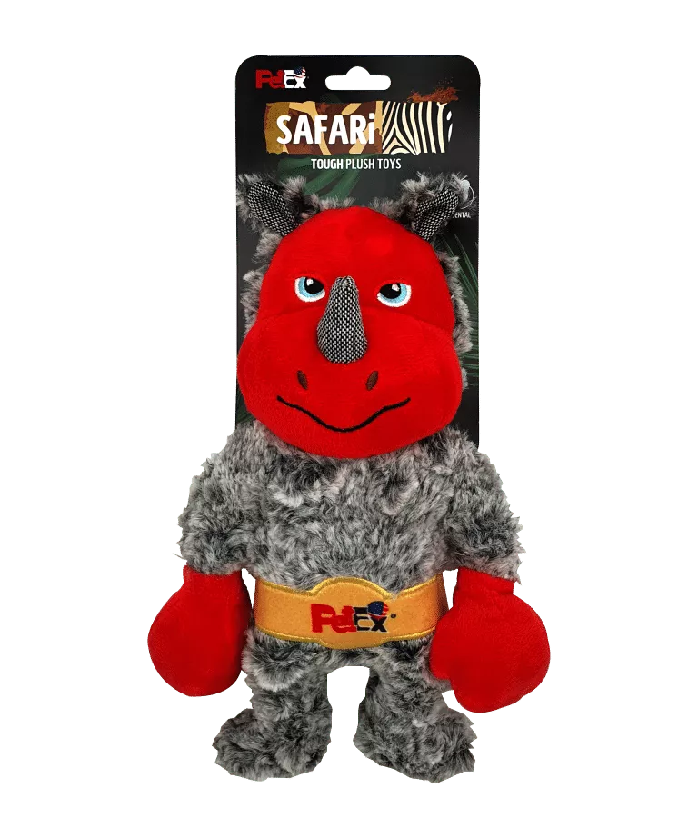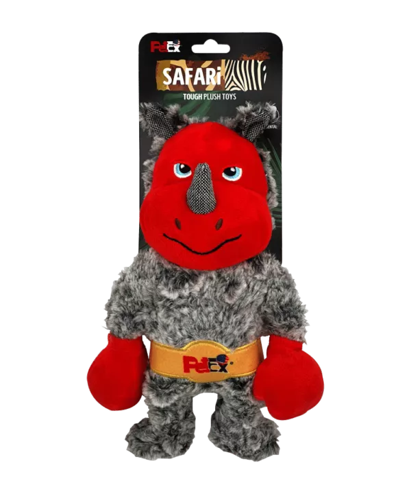 בובת משחק לכלב בדמות קרנף עם כפפות אדומות וחגורה ממותגת